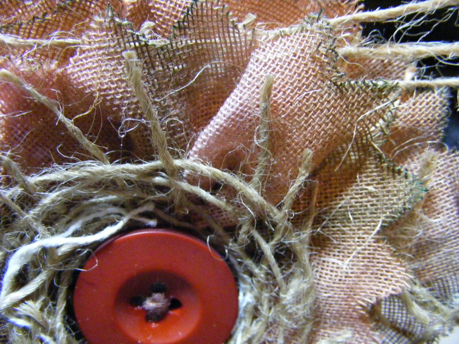I then took a spellbinder plain circle of card and placed double sided sticky onto it. I then took the gathered muslin and placed it around the circle going into the middle. As I did this I had a piece of material which was 'stringy' and decided to incorporate this in it as well by placing some glue along the piece of muslin. I then finished this off with a button. (Looks like a birds nest!)