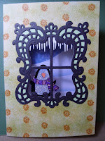 Once the front of the card was decorated I stuck the frame on to it with Cosmic Shimmer PVA glue. The acetate with the penguin on it has been stuck to the inside of the card using double sided strong tape. The icicles are cut with a Marianne Creatables die and stuck to the top of the window on the inside of the card. I have also cut another frame in plain white card and stuck that on the inside to tidy up where the acetate and icicles are attached.